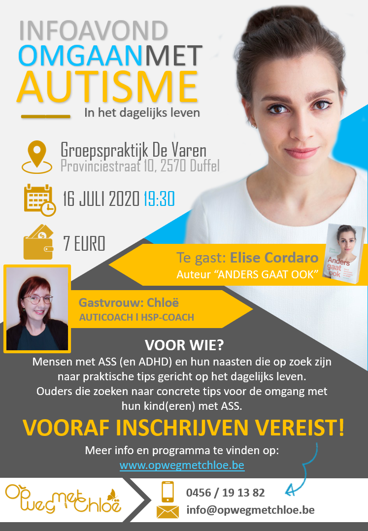 Op 16 juli 2020 organiseer ik een avond waarop jullie kennis met me kunnen maken en ik samen met mijn vriendin Elise Cordaro (bekend van haar boek "Anders Gaat Ook - Hoe ik functioneer met Autisme en ADHD") praktische tips met jullie wil delen ivm Omgaan met Autisme in het dagelijks leven.